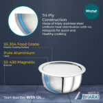 Winchef Steelanium Triply Induction Friendly TOP is manufactured with utmost care and precision. It ensures an impeccable feel and finishes with fantastic utility and efficiency. Winchef Steelanium Triply Cookware Series is a 3 Layer Construction. Three different layers of metal bonded together- food-grade 18/8 stainless steel and SS-430 magnetic stainless steel with an encapsulated layer of aluminium in the middle right throughout the cookware for an even distribution of heat. It comes with silicone handles which ensure handles don’t break easily as well as prevent them from getting too hot and keep your hands safe.